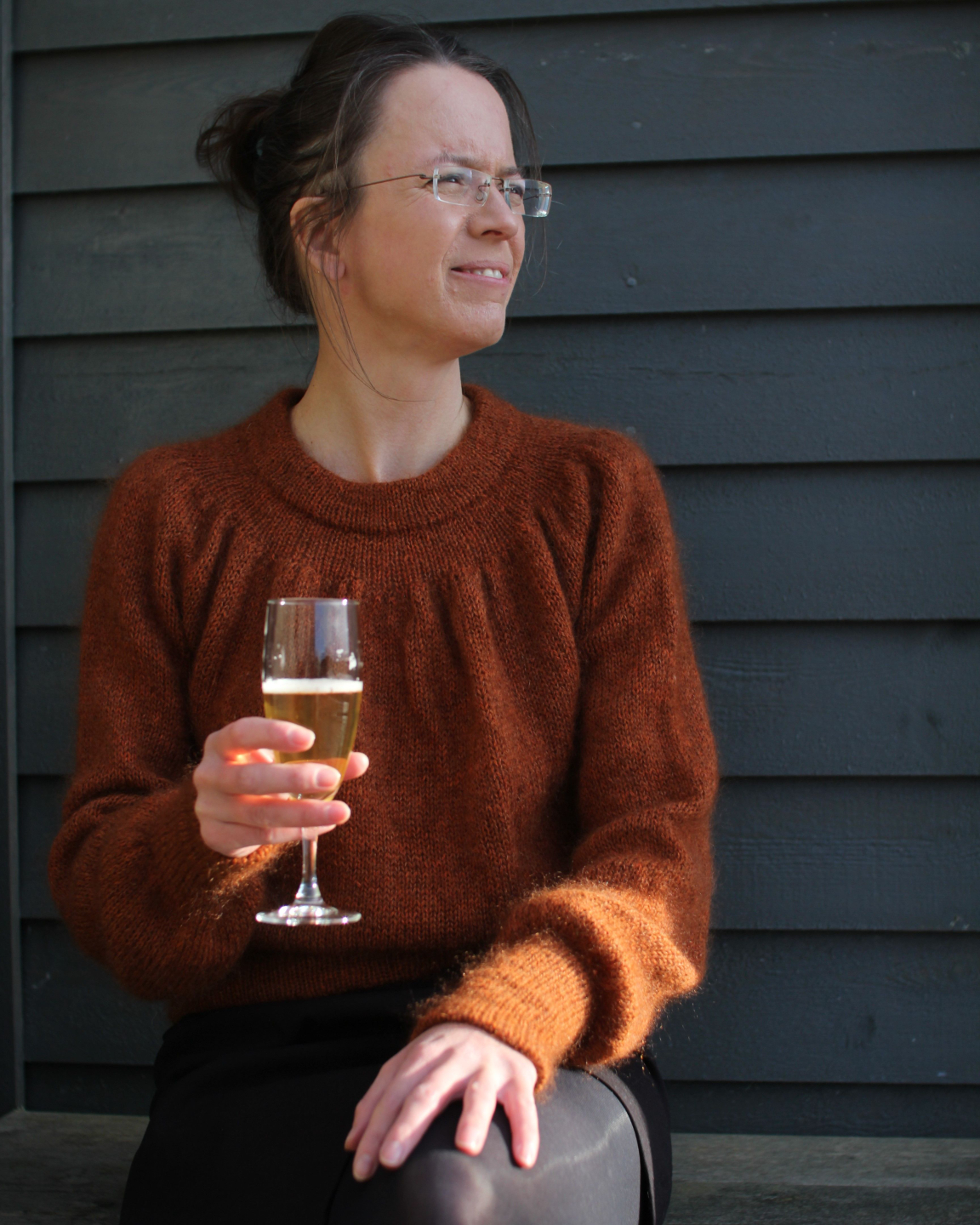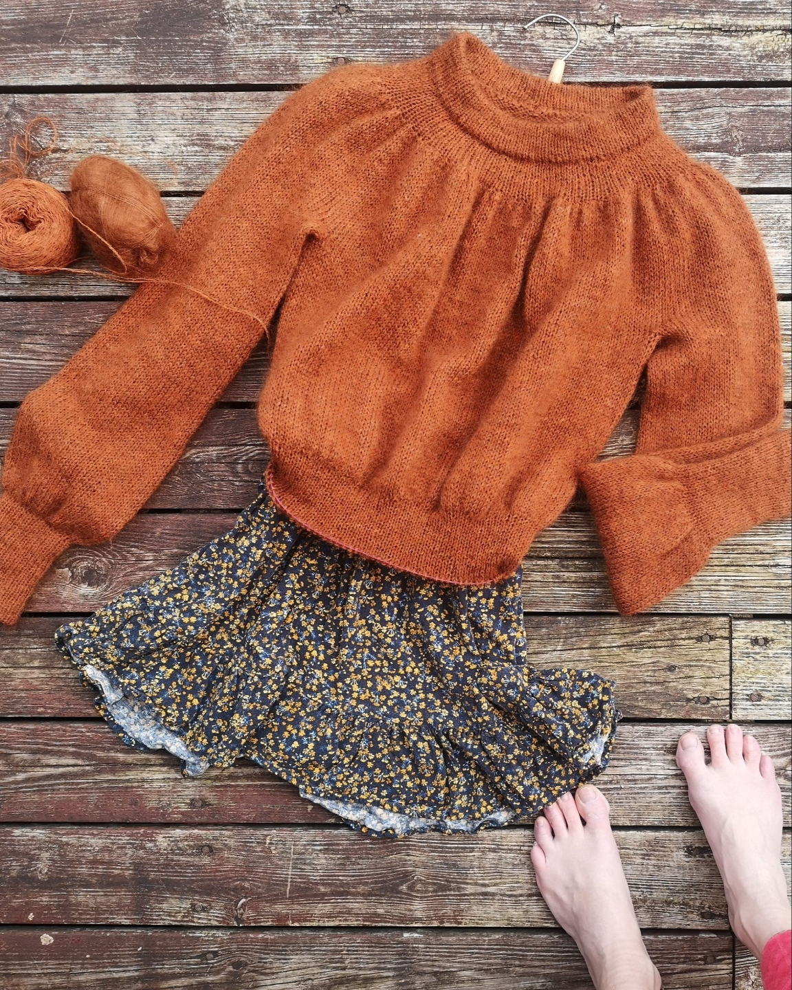 Gyllenbrun genser er strikka i Mjuk og Tilia, farge Glør og Red Squirrel.