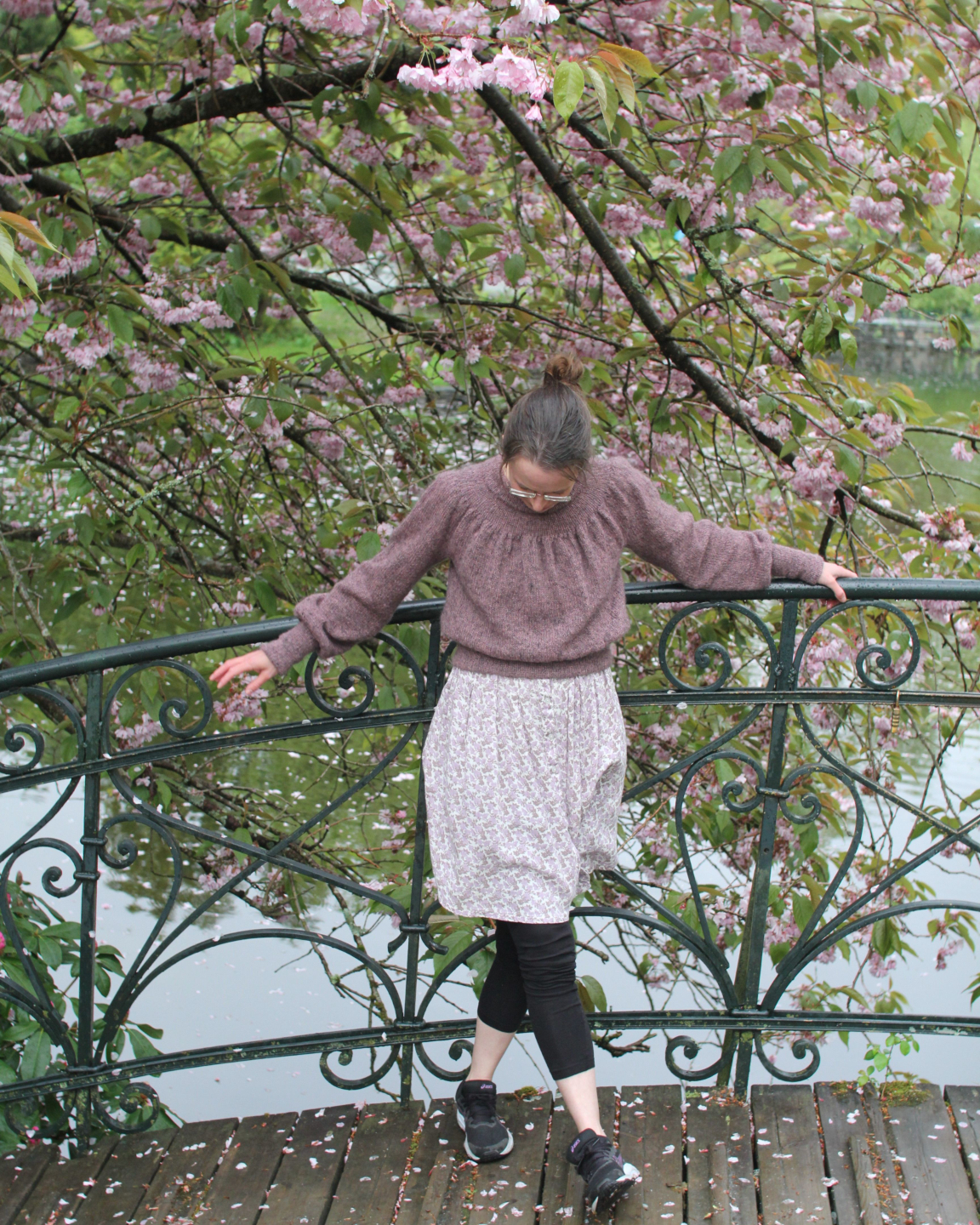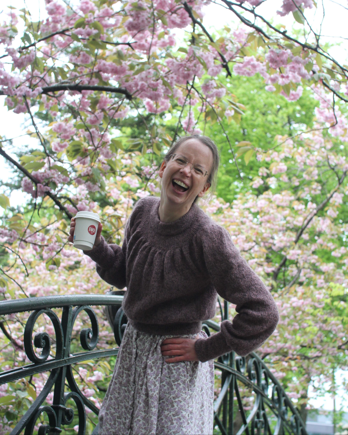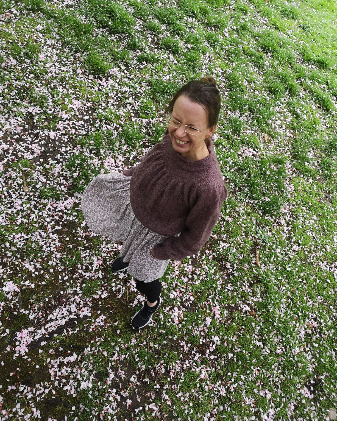 PS. Det hører med til historien at Frøken Tinde Pelsull i lys grålilla ble speedstrikka i mai 2023 for å rekke fotoshoot under blomstringa av kirsebærtræne. Vi rakk det aaaaakkurat i tide til å kjøre fotoshoot i Nygårdsparken i øsregn 12. mai. Dagen etter var trærne avblomstra.