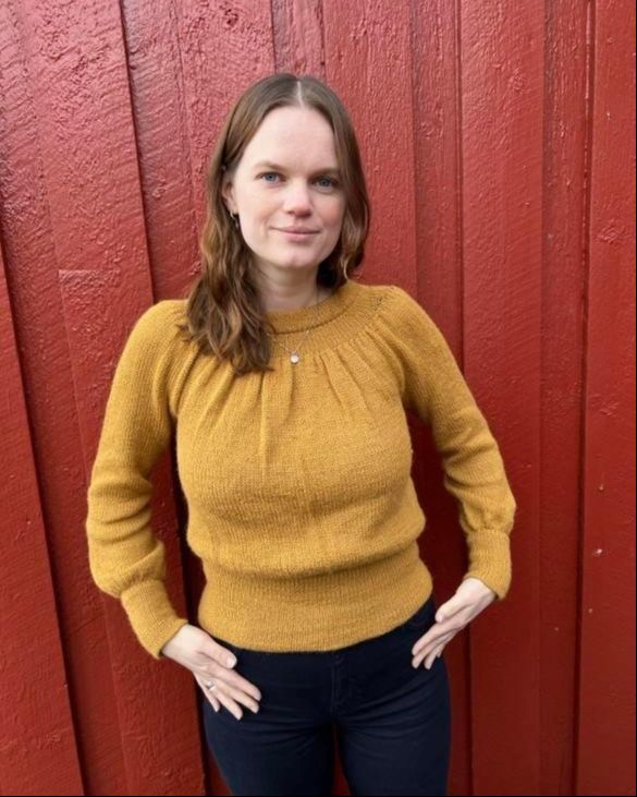 Frøken Fjong-genser er en klassisk, glattstrikka pyntegenser til dame med rundt bærestykke, strikket ovenfra og ned.