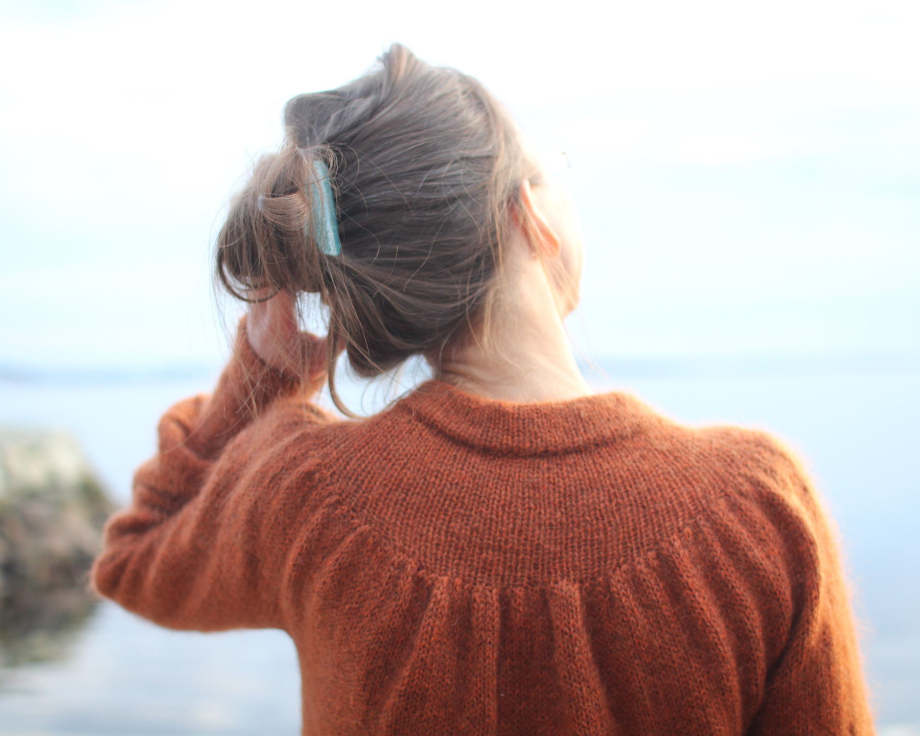 Du strikker så forkortede pinner over bakstykket for å gjøre genseren lengre bak, samtidig som det er dette som gir genseren den klassiske og kledelige buen øverst bakpå ryggstykket.
