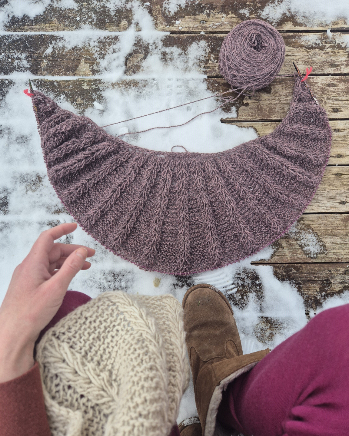 Det lilla sjalet jeg har på pinnen, strikker jeg i overskuddsnøster Tinde pelsullgarn fra Frøken Fjong-genser.